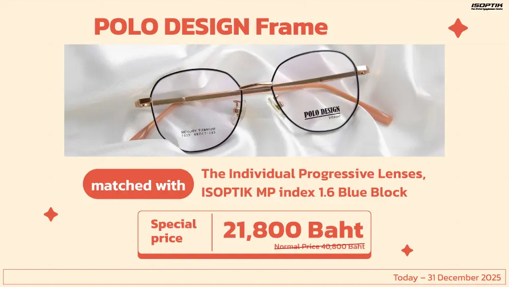 1. New POLO DESIGN frames, modern shape designed to support and conceal lens thickness 30% better than the previous model resulting in better weight support for the front of the eyeglasses reducing pressure on the nose area. Regular price 5,800 baht.