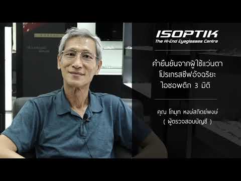 📣 ผมทำงานเกี่ยวกับตัวเลข ตรวจสอบบัญชีมันก็จะมีการใช้สายตาเยอะ เพราะฉะนั้นจะมีปัญหาเรื่องของสายตาซึ่งจะไม่คงที่ ก็ต้องปรับเปลี่ยนก็จะยุ่งยาก ในการที่เราจะเลือกให้มันเหมาะสมกับงานที่เราทำ ด้วยอายุที่เพิ่มขึ้นเรื่อยๆ ก็จะเป็นปัญหายุ่งยากพยายามจะค้นหาว่าที่ไหนมันพอจะมีอะไรที่มันจะทำให้เราเชื่อมั่นในการใช้งานได้มากขึ้น ก็เห็นว่า ISOPTIK มีการพูดถึงเรื่องนี้ว่า มีความเป็นมืออาชีพในเรื่องของ โปรเกรสซีพเลนส์ ซึ่งเราก็มีประเด็นเรื่องของสายตาสั้น สายตายาว และอาจจะมีสายตาเอียงด้วย ก็จำเป็นจะต้องใช้ผู้เชียวชาญ ที่จะมาดูแลให้ดีขึ้น ซึ่งปกติเราใช้โปรเกรสซีพเลนส์มาหลายปีละ