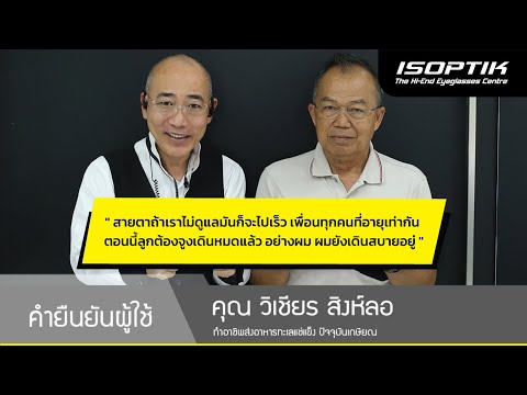 พอมาถึงไอซอพติกก็คุยกับเจ้าของเลย เขาแนะนำดี เราก็ตัดสินใจเลย โอ้ว!! ได้ผล จนมาครั้งนี้ก็ชุดที่ 3 แล้ว ส่วนมากใช้งานดูทีวีบ้าง เดินออกกำลังบ้าง ขับรถบ้าง ขับรถใช้ได้ดีมากเลย เห็นชัดดี คล้ายว่าเรามองเห็นไกล ดีกว่าแว่นที่ผ่านมาที่เราไปซื้อ แตกต่างเยอะเลย อันล่าสุดสังเกตดูใช้งานมานานถึง 4 ปี ก็ยังชัดอยู่ " คุ้มมากครับ สายตาถ้าเราไม่ดูแล มันก็จะไปเร็ว อย่างเพื่อนกันทุกคนที่อายุเท่ากัน ตอนนี้ไปไหนมาไหนลูกต้องจูงหมดแล้ว อย่างผม ผมยังเดินสบายอยู่ "