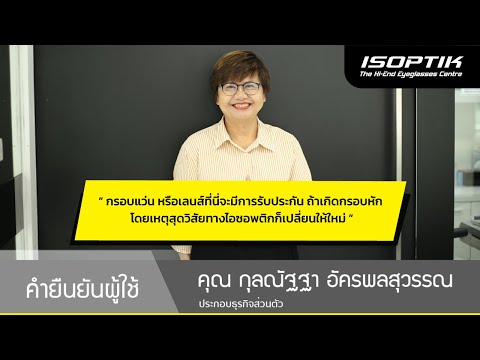 ดิฉัน กุลณัฐฐา อัครพลสุวรรณ อายุ ปี ประกอบธุรกิจเกี่ยวกับโรงงาน ทำงานด้านเอกสาร และคอมพิวเตอร์ ตอนนั้นมีปัญหาสายตาสั้น และได้คำแนะนำจากเพื่อนว่าน่าจะมาใช้บริการที่ไอซอพติก เพราะว่าการตรวจสายตาเขามีมาตรฐาน เราก็อยากจะดูแลสายตา เพราะเราใส่แว่นมานาน เราน่าจะมีผู้ที่ดูแลสายตาเราให้ดีที่สุด ก็เลยเลือกไอซอพติก