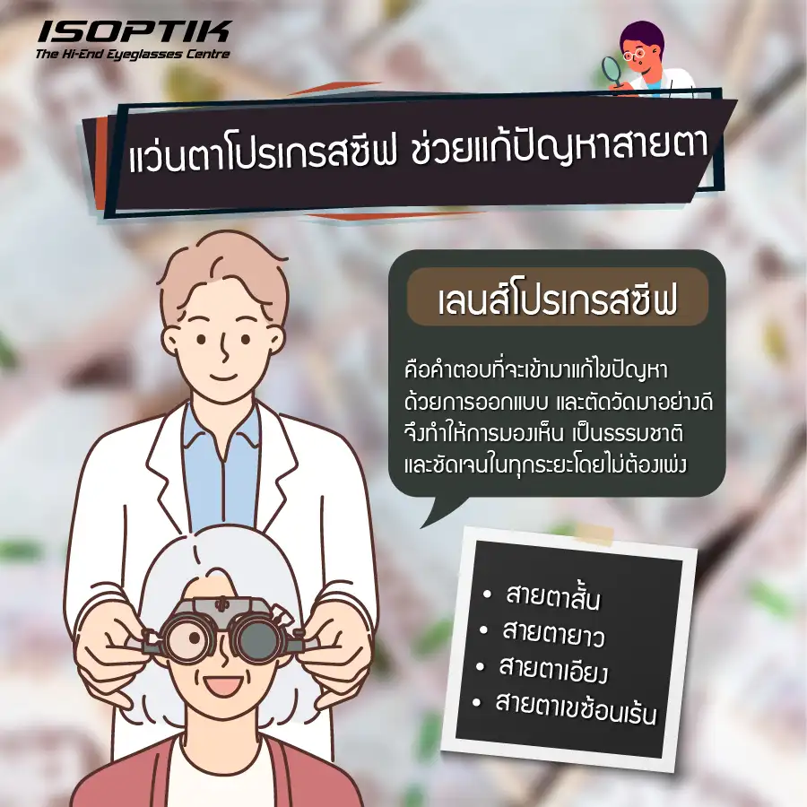 ภาวะสายตาผิดปกติ เป็นปัญหาที่ทำให้การใช้ชีวิตในทุก ๆ วันเป็นเรื่องยาก โดยเฉพาะผู้ที่ต้องใช้สายตา และความคิดตลอดทั้งวัน อาจรู้สึกเหนื่อยล้าได้ง่าย ส่งผลให้คุณภาพการใช้ชีวิตลดลงอย่างต่อเนื่อง แต่ที่ ISOPTIK เราได้พัฒนา แว่นโปรเกรสซีฟ อัจฉริยะ 3 มิติ เทคโนโลยีใหม่ขึ้นมา เพื่อคุณภาพการมองเห็นที่ดีกว่า สำหรับผู้ที่มีปัญหาสายตายาวตามวัย และใช้สายตาหน้าจอคอมพิวเตอร์เป็นเวลานาน ดังนั้น เลนส์โปรเกรสซีฟ คือ ทางออกสำหรับผู้ประสบปัญหาเหล่านี้ได้เป็นอย่างดี