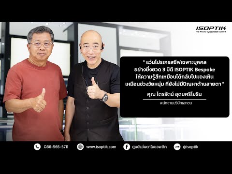 ปัจจุบันผมเริ่มคุ้นเคยและติดกับการใส่แว่นแล้วครับ ที่ศูนย์เลนส์โปรเกรสซีฟเฉพาะบุคคลอย่างยิ่งยวด ISOPTIK มีการวัดสายตาอย่างละเอียด ทำให้คุณภาพชีวิตดีขึ้นมาก ทั้งในด้านการมองเห็นและการใช้ชีวิตประจำวัน ความคุ้มค่าของแว่นสามารถสัมผัสได้จากการมองเห็นที่ชัดเจน ความคุ้มค่าตรงนี้ ถ้ารู้อย่างนี้ ใช้นานแล้ว ครับ "